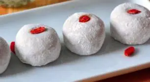 将制作好的枣泥取适量放入小面团中,用手捏成球状。