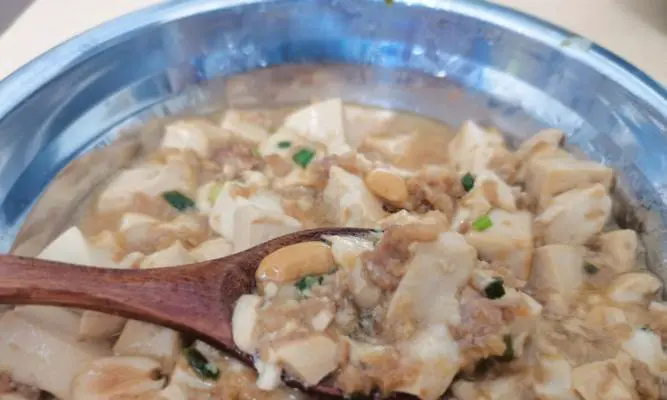 一份美味肉焖豆腐就完成了。豆腐软绵、肉香味浓,营养丰富,再配上一碗米饭,让你倍感温暖。