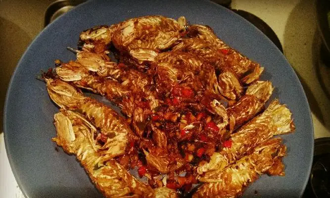 生姜、葱、蒜、干辣椒等调料用油炒香,待香味出来之后加入泡好的虾,翻炒均匀。