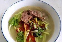 将制作好的肉丝放入面汤中,这样能够让口感更加丰富。