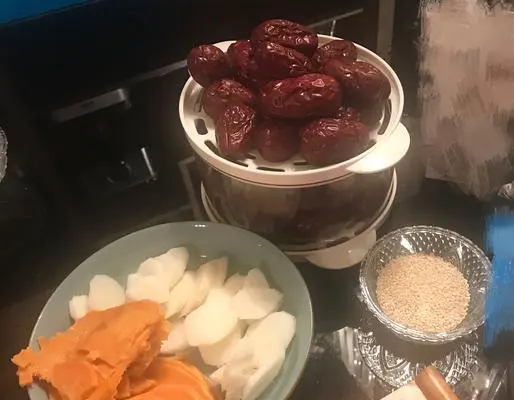 将山药、红薯和红豆放入锅中,加入适量清水,然后用小火煮制,直至食材变软,可以用勺子压碎。