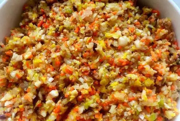 首先准备面团,将面粉和清水混合搅拌至面团稍硬即可,静置10分钟左右。菜花、胡萝卜等蔬菜切碎,香菇和豆腐切成细末,加入蔬菜中拌匀备用。