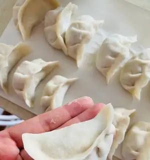 将馅料放在饺子皮上,然后将饺子皮对折,将边缘捏紧,固定馅料。每个饺子要包得紧实,以免煮熟后饺子裂开。