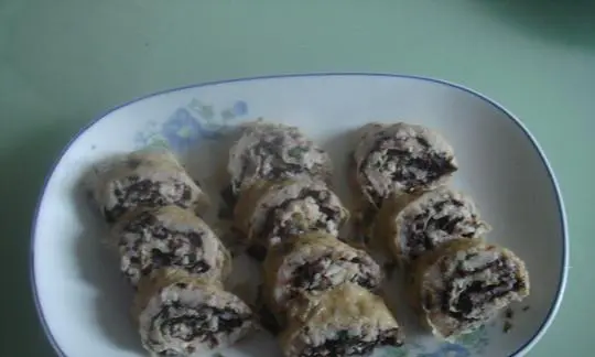 将腌制好的蔬菜和乌鸡肉馅放在紫菜卷皮上,卷起即可。卷时注意卷得紧实,以免松散。