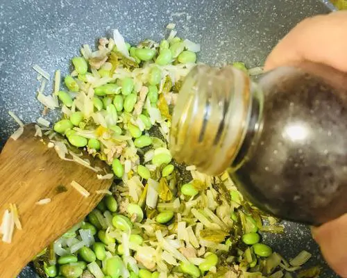 将焯过水的毛豆加入锅中,用大火翻炒均匀,直到毛豆表面均匀地覆盖着雪菜酱。