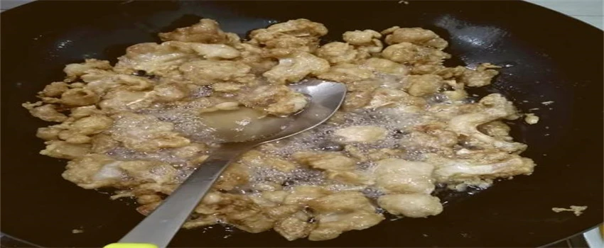 在熬制猪油的时候,要始终观察猪油的火候,当发现猪板油颜色变黄的时候,一定要加入姜片、葱段以及花椒,在增加一些白酒,这样猪板油当中的那股子心气就被完全去除了,同时清香之气也被完全激发,当颜色彻底变得焦黄之后,就可以关火了。