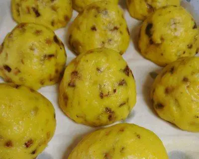 将发酵好的面团揉成长条状,均匀分成大小相等的小块,再将每块面团揉成球状。
