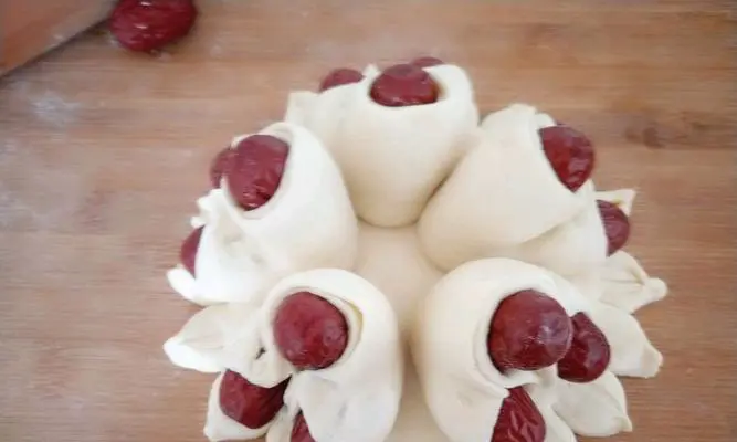 把发酵好的面团拿出来,放在案板上揉几下,把面团变得更加柔软。然后将面团分成若干个小面团,每个小面团揉圆。