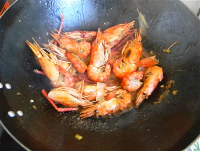 然后把刚才调好的料汁搅拌均匀倒进锅里面。用铲子翻炒均匀,然后盖上盖子小火闷两分钟。打开盖子看汤汁的多少。如果汤汁还比较多,可以调成大火收汁。把汤汁收粘稠之后,撒上香葱段和蒜末翻炒均匀即可出锅。这样做的油焖大虾连虾壳都是可以吃的,而且虾壳也比较酥脆,含的钙也很高,营养价值还是不错的,不过肠胃不好的人不要连虾壳一起吃。
