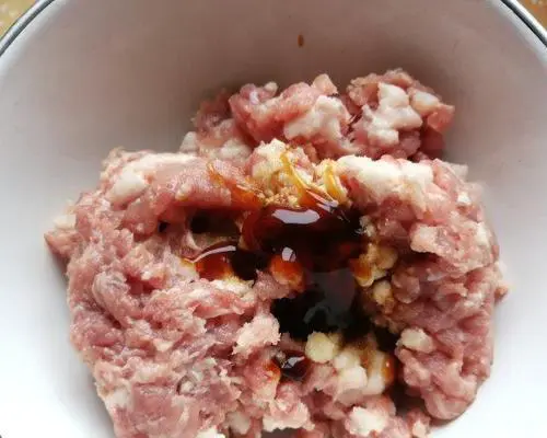 将猪肉切碎,加入葱姜蒜末、生抽、鸡精、白胡椒粉等进行调味。冬菇泡软后切成小丁,加入猪肉馅中。