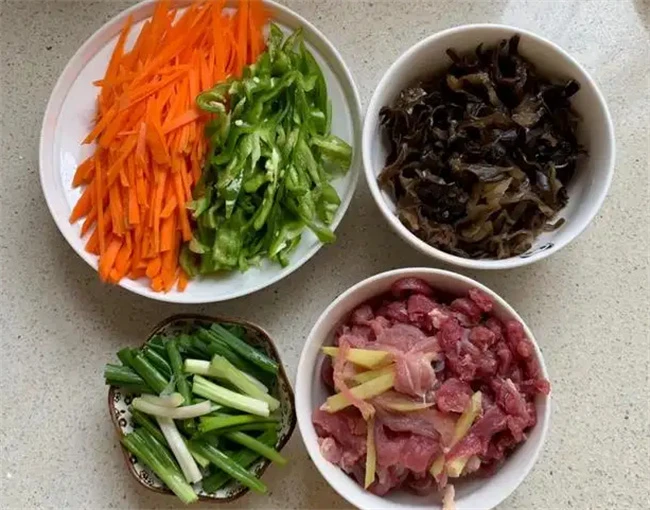 所有的材料都准备好之后,先把肉切成细丝,放在清水里面浸泡出血水,然后冲洗几遍控干水分放在大碗里面,加入适量盐,一个蛋清适量淀粉抓拌均匀,感觉到肉丝明显的有黏度。我喜欢吃颜色比较深一点的,可以在腌制肉丝的时候加入一点生抽或者是老抽上一下色。抓匀的肉丝里面再倒入适量食用油,麻烦均匀之后放在一旁备用,这个时候切配料,把胡萝卜,青椒,木耳都切成细丝,蒜苔切成段。葱姜切成末。