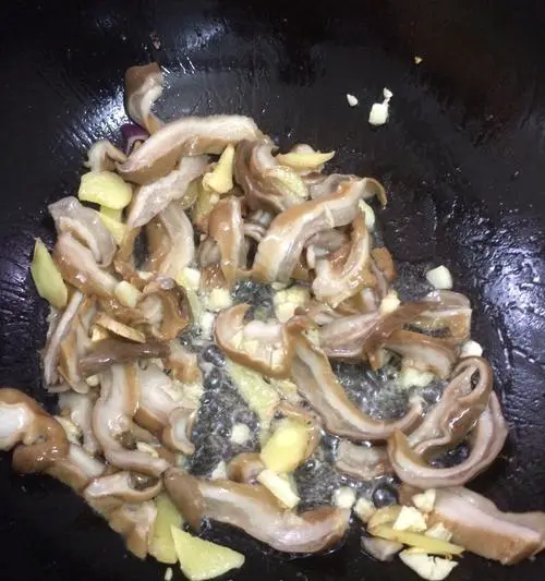 将切好的猪肚放入锅中,煸炒均匀,再倒入适量的料酒翻炒。