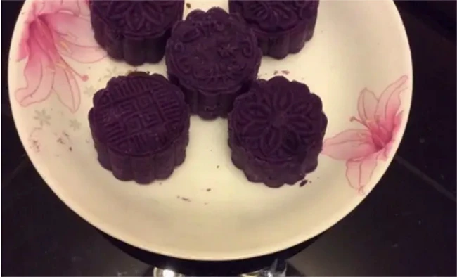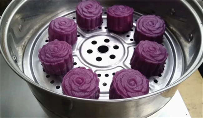不好的紫薯面团,我们把它分成均匀的小剂子,然后把它捏成一个圆饼,加入我们提前准备好的豆沙馅料,把它搓成一个光滑的小球,把提前准备好的月饼模具把做好的紫薯球放入到模具中压成月饼的形状,然后放入蒸笼中,水开之后蒸8~10分钟就可以出锅食用,味道非常的好吃。