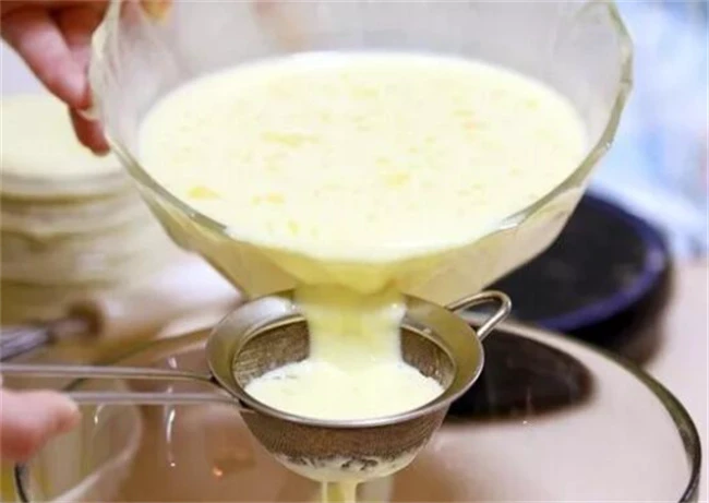 没有柠檬汁也可以放上几滴白醋,实在没有不放也行。把蛋液充分搅匀之后再把牛奶加进去,继续用筷子搅拌均匀,必须要把蛋清和蛋黄全部打散和牛奶完全融合到一起,也让白糖融化,不然烤出来的蛋挞味道不好。打好的蛋液为了让他能够更细化,考出来没有那么多蜂窝可以用。一筛过滤两遍,过滤掉里面的气泡和没有搅散的蛋液。