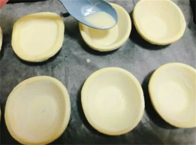 然后把蛋液加到蛋挞皮里面,7~8分满就可以了,如果太满了,烤的时候就会跑出来。在打蛋液的时候,要先把烤箱打开,上下火200度预热。蛋挞做好之后,放到烤箱里面调到180度,上下火烤20分钟,具体的烤制时间要根据自己家烤箱的脾气决定中途多观察蛋挞的上色情况,如果上色比较深就调小一点火,上色前就调大一点。