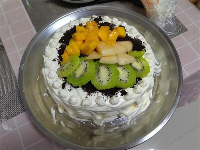 蛋糕膜脱下来以后,完全凉透再打发淡奶油打发的过程适量加入炼乳或者是白糖提升淡奶油的甜味。打发好的淡奶油装进裱花袋,随意挤出自己喜欢的花型,如果喜欢带颜色的花,也可以加入一点食用色素。在摆上水果,就这么简单的几步一个生日蛋糕就做好了。