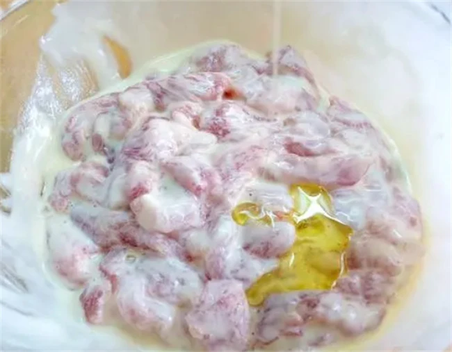 里脊肉控干水分之后放入大碗里面,加入适量盐,胡椒粉用力的抓匀,感觉肉的水分完全进去了,有些粘手就可以了。准备一个大碗里面打入一颗鸡蛋,按照1:1的比例加入面粉和淀粉。把鸡蛋和面粉调成酸奶糊状,如果感觉有些干就加入适量清水,不要一次加太多分,多次加进去,这样能调的比较均匀。调好的面粉糊里面滴入几滴醋,这样炸出来的里脊肉外皮更酥脆。