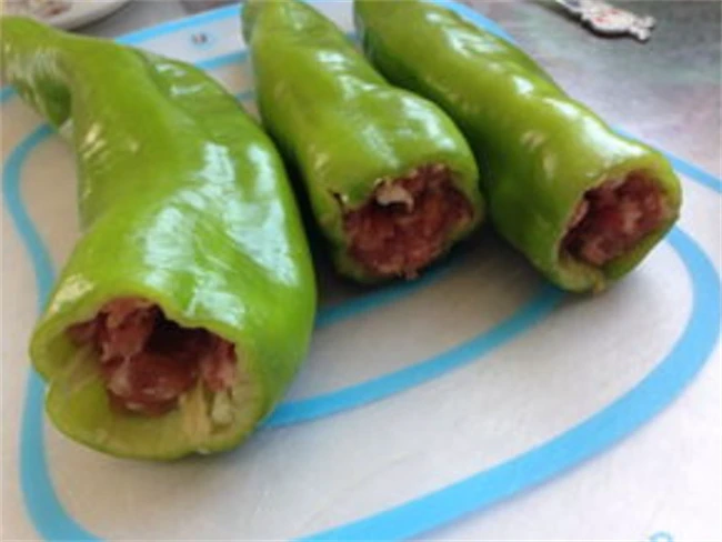 先把五花肉切碎剁成肉馅儿。也可以在市场上买肉的时候,让老板帮忙搅成馅儿。肉馅装在碗里面,加入盐,蚝油,十三香,生抽,喜欢吃颜色深点的也可以放点老抽。把肉馅顺着一个方向搅拌均匀上劲,就像平时我们调饺子馅一样。然后把提前准备好的尖椒洗干净,捅掉里面的籽儿。如果尖椒比较长,可以从中间切成两段。提前调好的肉馅用勺子塞进青椒里面。喜欢吃肉馅儿可以多放点儿。