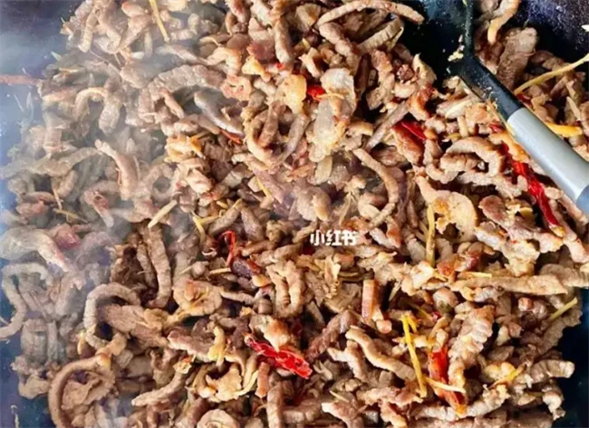 把锅洗干净,烧热之后,加入形容油油温7成热的时候,把腌好的肉丝放进去,大火煸炒,直到把牛肉的水分炒干调成小火,放入葱姜,干辣椒丝和花椒炒香。加入一勺郫县豆瓣酱,炒出红油,然后倒入一点香醋,吃起来口感更好再加入一勺,生抽半勺食用盐半勺白糖半勺,鸡精继续翻炒均匀。这个时候的牛肉已经熟了,可以尝一下口感,如果还没到自己喜欢的干爽程度,可以再多炒一会儿。
