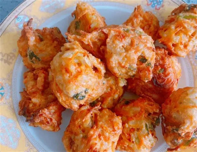 锅里面多烧点油,油温5成,热的时候转成最小火,左手右手抓胡萝卜从壶口地方挤成丸子,用小勺儿一个一个的放到油锅里面。刚放进去的丸子不要推动小火炸制定型之后再慢慢的推动,避免把丸子搅散。全程都要开小火,慢慢炸,需要有耐心,丸子炸至金黄熟透之后就可以捞出来控油趁热吃,外焦里嫩,特别香,如果喜欢吃烧烤料也可以撒上点烧烤料。