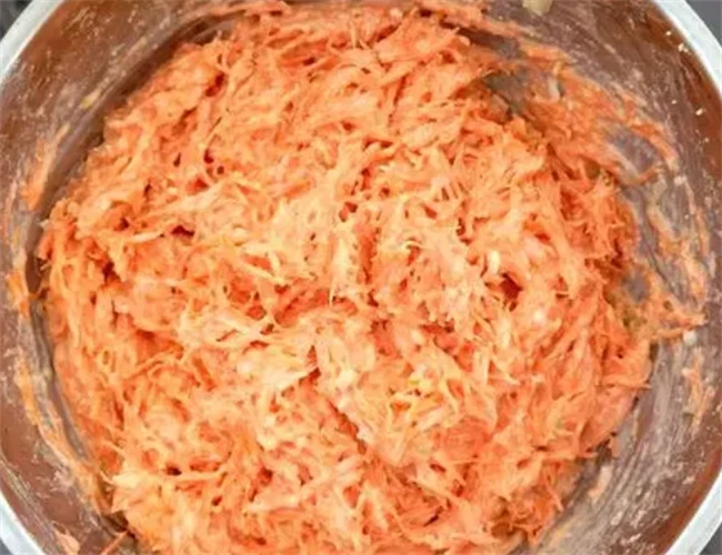 把胡萝卜洗干净,挂掉外面的老皮,用擦拭器擦成细丝,然后再用菜刀剁成碎末,剁得越碎越好。不过如果喜欢吃颗粒感比较浓的,就剁得稍微长一点,这就是完全随意。香菜洗干净切成末放在一边备用,胡萝卜剁好之后放在一个大一点的盆子里面。先加入适量食用盐,十三香,蚝油把胡萝卜搅拌均匀。胡萝卜里面打入一个鸡蛋,如果胡萝卜比较多,就要放两个鸡蛋。基本上一斤胡萝卜,放一个鸡蛋就差不多。