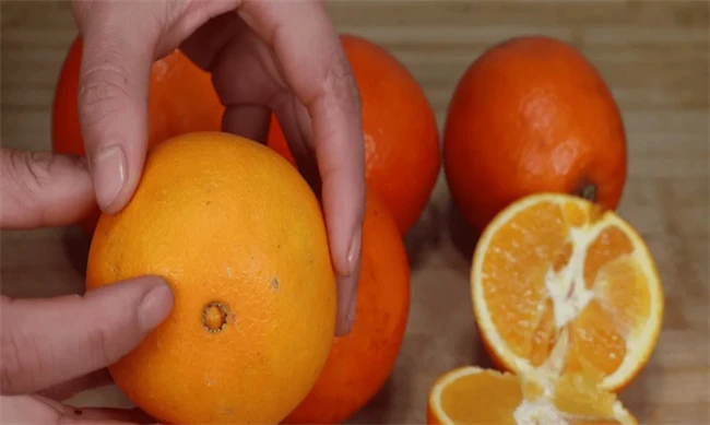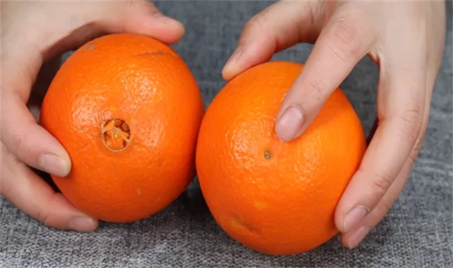 我们在挑选橙子的时候,可以首先看橙子的果脐,通过观察果脐的凹陷以及突出来选择橙子,如果橙子的果脐是向内凹陷的,并且果脐可以看出开裂的状况,这种橙子一般是果肉比较饱满且鲜甜的优质橙子,而果脐向外突出的橙子,一般果肉并不饱满,果肉较白,汁水较少,这样的橙子口感比较差。
