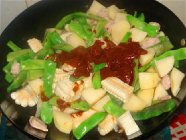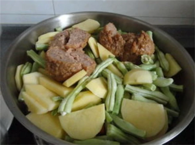所有的蔬菜必须要翻炒均匀,加入适量盐,蚝油老抽炒到菜上色,然后加入适量开水盖上盖子,大火炖。加水的时候一定要一次把水加足。如果中途水烧干了,菜不熟,这样做出来的菜就不好吃。大约炖15分钟左右,土豆和豆角完全软烂成熟锅里的汤汁剩的不多,关火,在切点葱花和蒜末撒到锅里面,然后翻炒均匀出锅,配上点米饭吃,简直绝绝子。