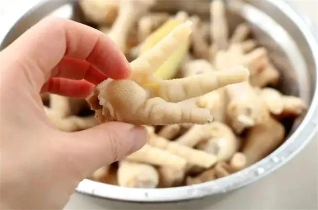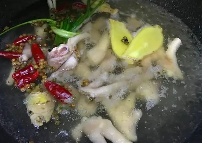 锅里面加入适量清水,把鸡爪直接下进去,水开之后会出现很多浮沫。一直保持大火,用勺子打掉表面的浮沫。这些浮沫都是鸡爪里面的血水和油脂,必须要打干净,这样做出来的鸡爪没有腥味儿。在开始的时候就要把水加足,不然总是保持大火再煮汤,很快就烧干了。煮好的鸡爪捞出来之后,马上放在凉水里面洗掉表面的油脂和血沫。