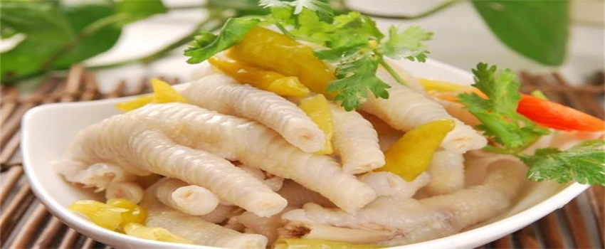 既然制作泡椒凤爪,那么我们就需要将煮过的鸡爪清洗干净,放到密闭的玻璃容器当中,再向玻璃容器里面放入适当的泡椒,白醋,鸡精,白糖等等。而事先切好的胡萝卜,芹菜也直接放到里面,之后再花椒,八角,茴香等等香料也完全放到玻璃的密闭容器当中。通常情况下,在密封的容器当中,腌制12个小时,此时泡椒凤爪已经制作完成。
