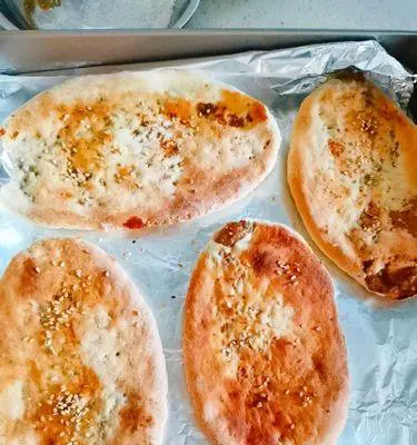 取出烤好的锅盔,撒上葱花和辣椒碎即可食用。