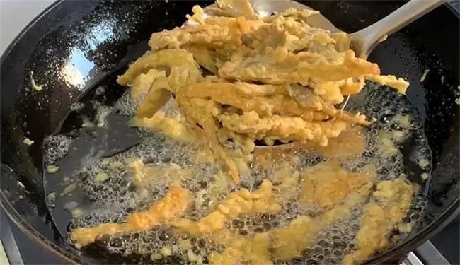 把面糊放在一旁,静置15分钟左右。这时候你观察面糊就会发现面糊里面的水出来了,没关系再用筷子顺着原来的方向继续搅匀,面糊就变成非常丝滑的酸奶状。如果喜欢吃五香粉的味道,在二次搅拌的时候加入适量五香粉。面糊搅拌好之后,把锅烧,热加入适量油,油要多放一些,油少了炸的蘑菇不好吃。油温5成热,左右转成小火,把蘑菇一个一个的放到面糊里面,裹上面糊再下油锅炸。