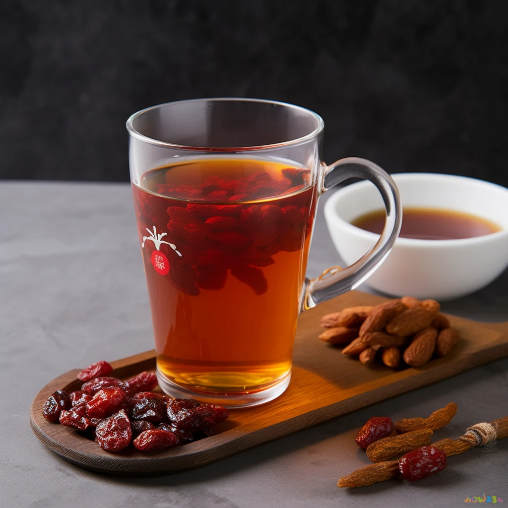 红枣枸杞茶是一种非常受欢迎的中式草药茶。它由红枣和枸杞子制成,这两种草药都有着悠久的历史和文化背景。红枣被认为是中国的传统草药之一,有许多医学和营养价值。枸杞子也是一种受欢迎的中药,具有多种药理作用,如免疫调节、抗肿瘤、抗氧化等。这种茶不仅味道美味,而且有很多健康益处。