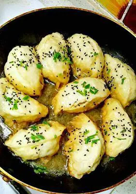 将煎好的水煎包装盘出锅,上面可以撒上少许葱花或香菜,配上自制的醋汁或辣椒油,味道更佳。