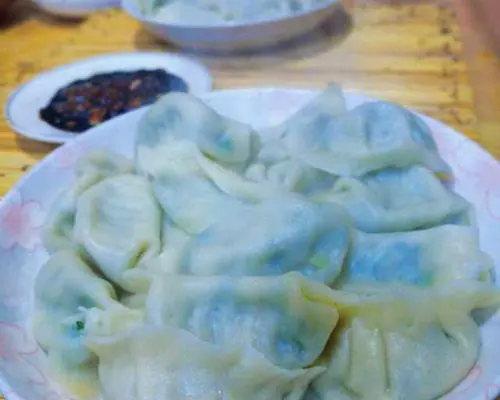 将煮好的饺子装盘,撒上葱花和香菜,淋上适量的醋和辣椒油,即可享用美食。