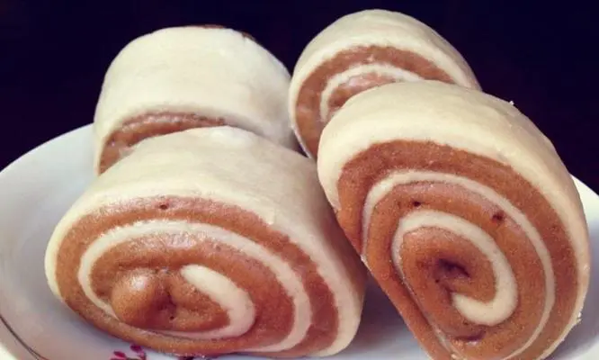 蒸熟后的双色馒头卷呈现出美丽的双色外观,取出后放置待凉。