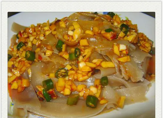 将粉皮切成丝或细条,和面条一起拌食,口感爽滑可口。