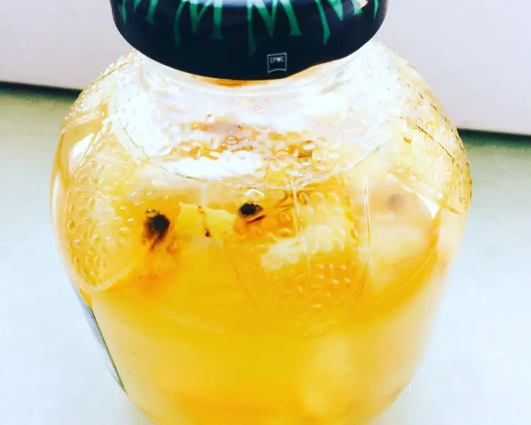 将煮好的生姜水倒入装有金桔汁的瓶子中,混合均匀,调整口感后加入适量的蜂蜜搅拌均匀。