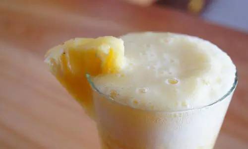 将椰子肉加入奶昔后,再次开启高速搅拌器,让所有材料混合均匀。